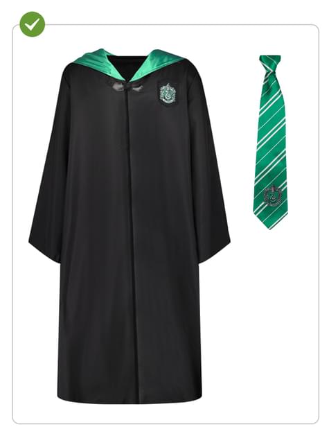 Ovaj model uključuje crnu haljinu s kapuljačom i zelenu unutrašnjost, zajedno s prugastom kravatom u srebrnim i smaragdnim nijansama. Ispisani grb Slytherin se ponosi na grudima kao simbol vaše lojalnosti zmiji. Napravljen od 100% poliestera, nudi laganost i udobnost, idealan je za karneval i cosplay.